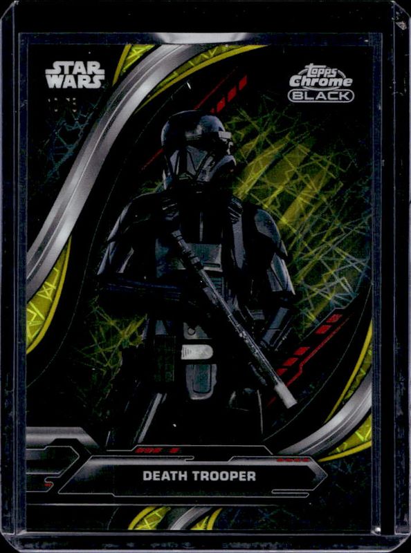 The biggest 30-day change Death Trooper cards are 2024 Topps Chrome Black Star Wars #82 Yellow Lazer Refractor /75, 2024 Topps Chrome Black Star Wars #82 Rainbow Refractor /199, and 2024 Topps Chrome Black Star Wars #82 Base.