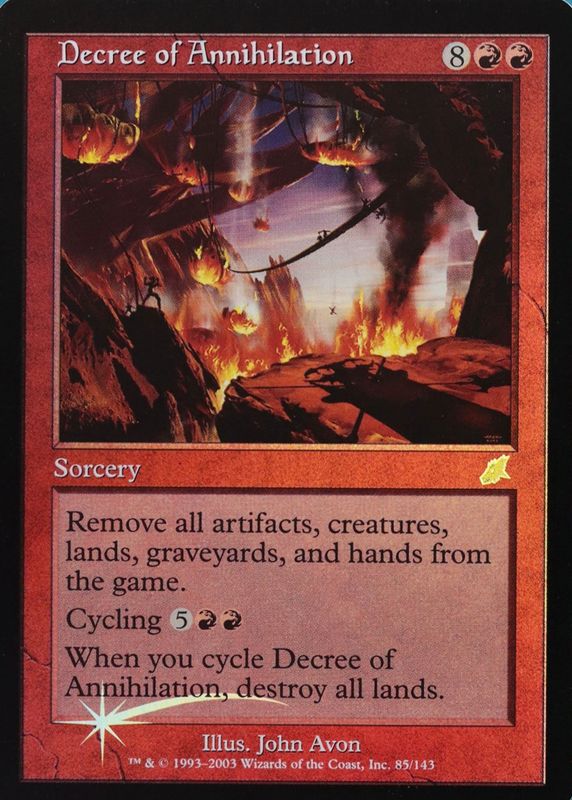 Decree of Annihilation's Magic: The Gathering cards are available in at least 1 sets. Decree of Annihilation's biggest 7-day price movers are 2003 Scourge #85 Foil, and 2003 Scourge #85 Base.
