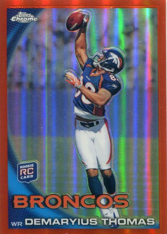 Demaryius Thomas' Football cards are available in at least 37 sets. Demaryius Thomas' biggest 7-day price movers are 2010 Topps Chrome #C110 Orange Refractor, 2010 Topps Chrome #C110 Gold Refractor /50, and 2010 Topps Chrome #C110 Red Refractor /25.