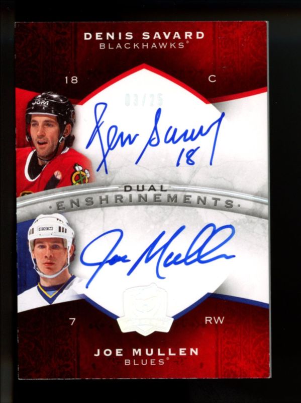 Denis Savard / Joe Mullen's Hockey cards are available in at least 2 sets. Denis Savard / Joe Mullen's biggest 7-day price movers are 2008 Upper Deck The Cup #CE2-SM Enshrinements Dual /25, 2008 O-Pee-Chee Premier #2PI-MS Inductions Ink Dual Gold /10, and 2008 O-Pee-Chee Premier #2PI-MS Inductions Ink Dual /50.