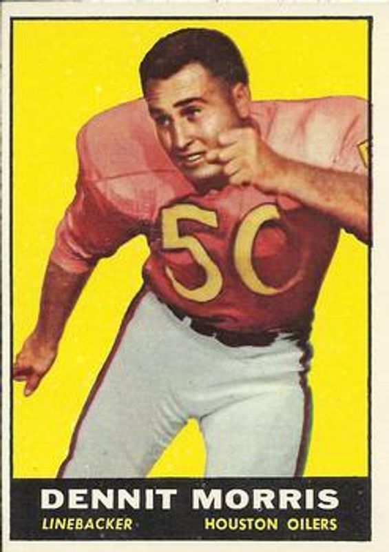 Dennit Morris' Football cards are available in at least 3 sets. Dennit Morris' biggest 7-day price movers are 1961 Topps #147 Base, 1962 Fleer #53 Base, and 1961 Fleer #175 Base.