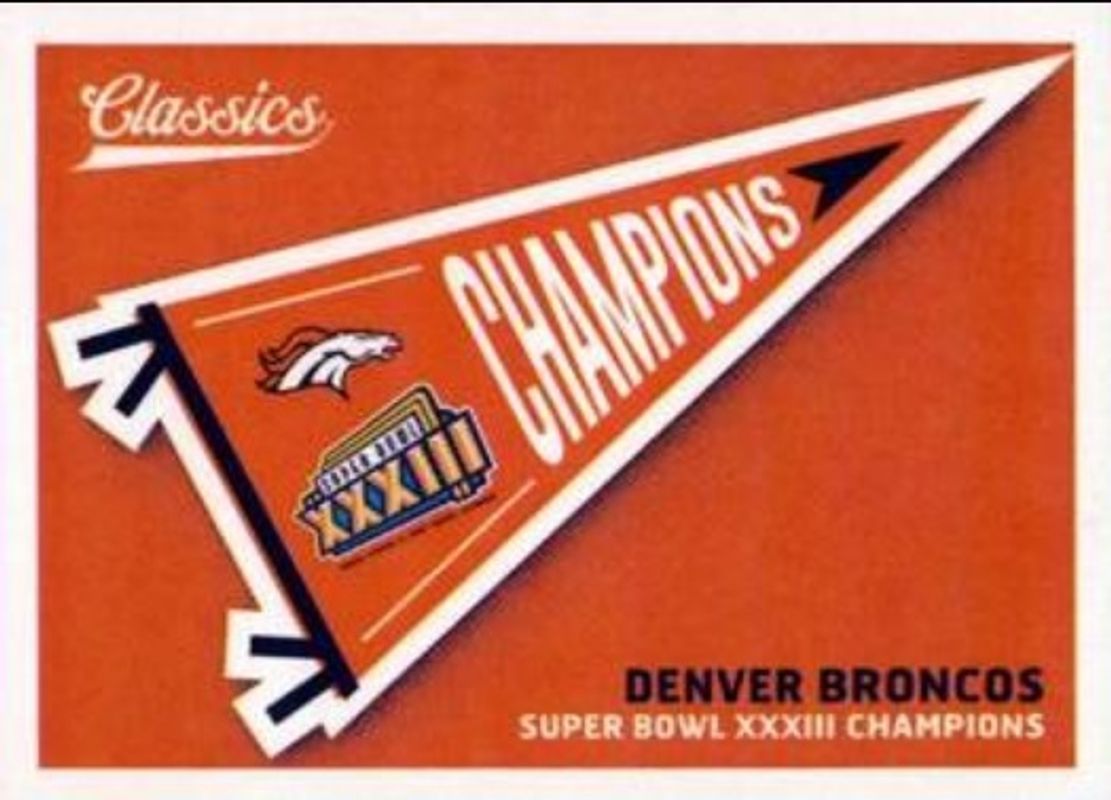 Denver Broncos' Football cards are available in at least 25 sets. Denver Broncos' biggest 7-day price movers are 2018 Classics #9 Team Pennants, 2018 Classics #11 Vintage Logo Stickers, and 2013 Topps #42 Printing Plates Yellow /1.