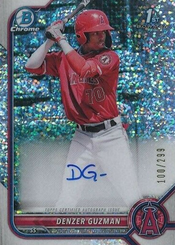 Denzer Guzman's Baseball cards are available in at least 4 sets. Denzer Guzman's biggest 7-day price movers are 2022 Bowman #CPA-DG Chrome Prospect Auto - Speckle Refractor /299 (1st), 2023 Topps Pro Debut #PDC-30 Base Chrome - Refractor /99, and 2023 Topps Pro Debut #PDC-30 Base Chrome - Superfractor /1.