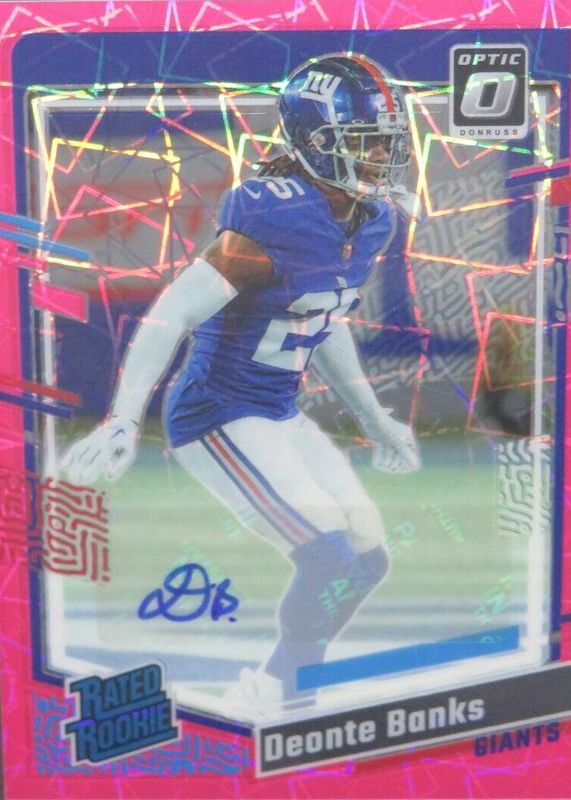 Deonte Banks' Football cards are available in at least 4 sets. Deonte Banks' biggest 7-day price movers are 2023 Optic #278 Rated Rookie Autographs - Pink Velocity /50, 2023 Optic #278 Rated Rookie Autographs - Black Pandora /25, and 2023 Prizm #376 Rookie Autographs - Silver.