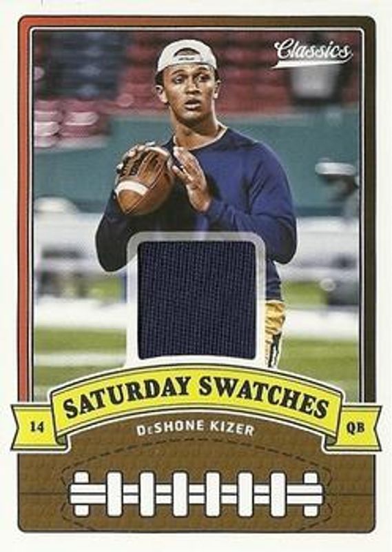DeShone Kizer's Football cards are available in at least 21 sets. DeShone Kizer's biggest 7-day price movers are 2018 Classics #8 Saturday Swatches, 2018 Classics #8 Saturday Swatches - Prime /35, and 2018 Plates & Patches #103 2017 Panini Immaculate - Printing Plates Black /1.