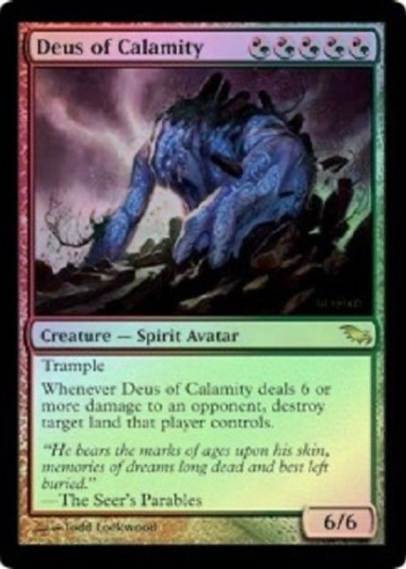 Deus of Calamity's Magic: The Gathering cards are available in at least 1 sets. Deus of Calamity's biggest 7-day price movers are 2008 Shadowmoor #204 Foil.