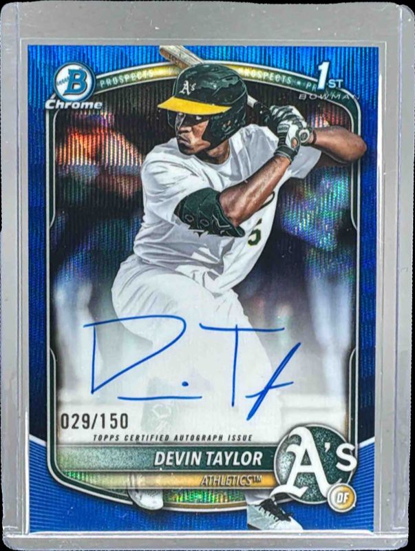 Devin Taylor's Baseball cards are available in at least 5 sets. Devin Taylor's biggest 7-day price movers are 2025 Bowman Draft #CPA-DT Chrome Prospect Auto (1st), 2025 Bowman Draft #CPA-DT Chrome Prospect Auto - Blue Wave Refractor /150 (1st), and 2025 Bowman Draft #CPA-DT Chrome Prospect Auto - Refractor /499 (1st).