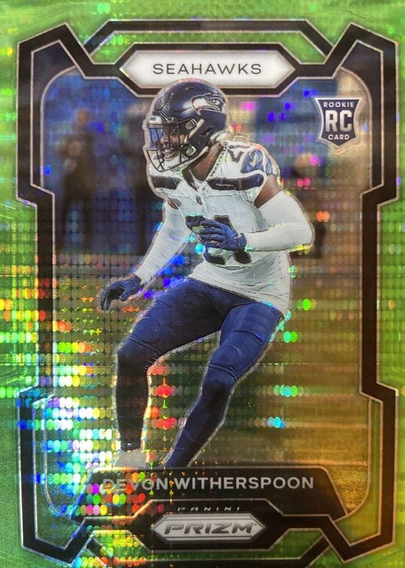 Devon Witherspoon's Football cards are available in at least 17 sets. Devon Witherspoon's biggest 7-day price movers are 2023 Optic #292 Holo, 2023 Prizm #389 Silver, and 2023 Optic #292 Purple Shock.
