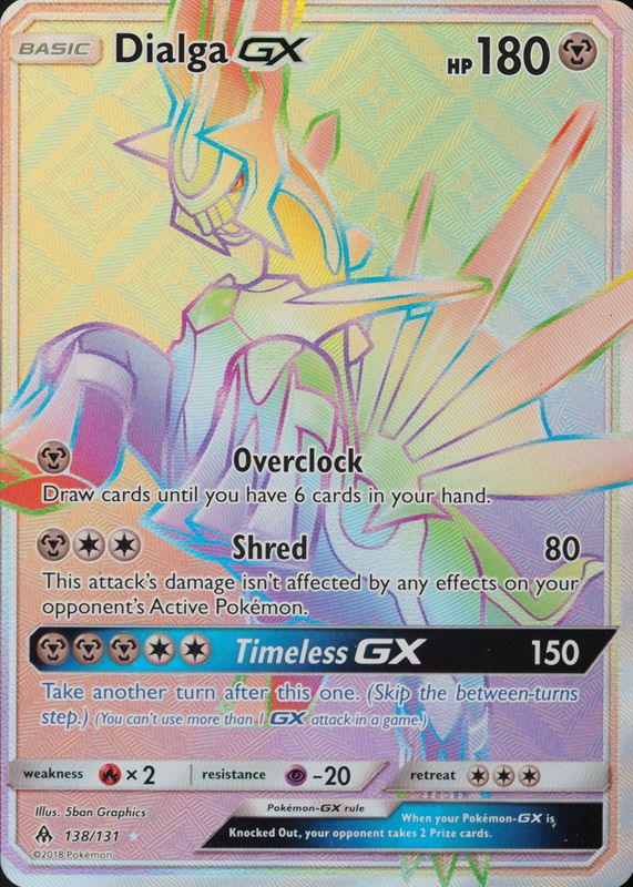 Dialga GX's Pokemon cards are available in at least 4 sets. Dialga GX's biggest 7-day price movers are 2018 Sun & Moon: Forbidden Light #138/131 Holo (Secret), 2018 Japanese Sun & Moon: Ultra Force #054/050 Super Rare (Full Art), and 2018 Sun & Moon: Forbidden Light #125/131 Holo (Full Art).