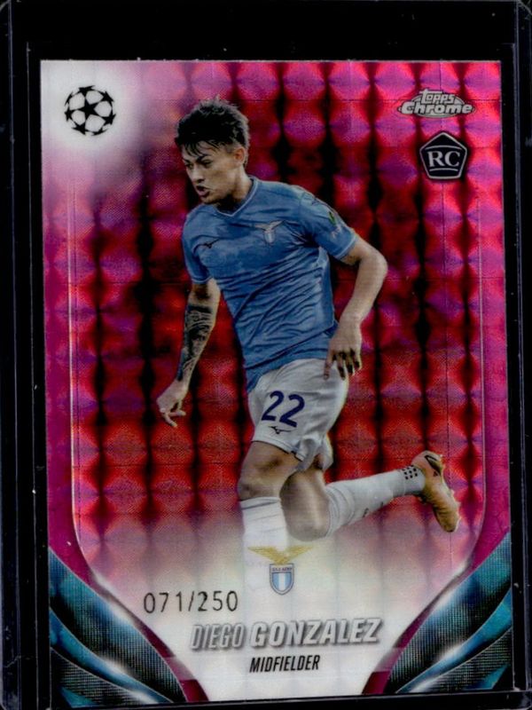 Diego Gonzalez's Soccer cards are available in at least 6 sets. Diego Gonzalez's biggest 7-day price movers are 2023 Topps Chrome UEFA Club Competitions #125 Pink Geometric Refractor /250, 2023 Topps Chrome UEFA Club Competitions #125 Refractor, and 2023 Topps Chrome UEFA Club Competitions #125 Night Vision RayWave Refractor /225.