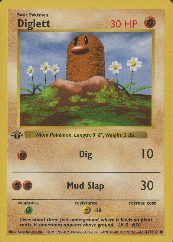 Diglett's Pokemon cards are available in at least 26 sets. Diglett's biggest 7-day price movers are 1997 Japanese Rocket Gang #50 Base, 2000 Team Rocket #52/82 1st Edition, and 2007 Diamond & Pearl: Secret Wonders #085/132 Base.