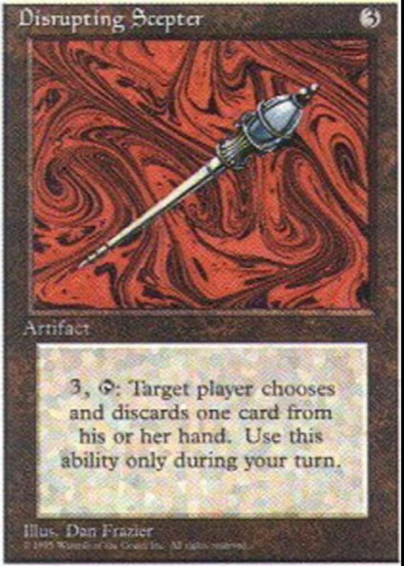 Disrupting Scepter's Magic: The Gathering cards are available in at least 5 sets. Disrupting Scepter's biggest 7-day price movers are 1995 Fourth Edition Base, 1993 Unlimited Edition Base, and 2001 Seventh Edition #293 Foil.