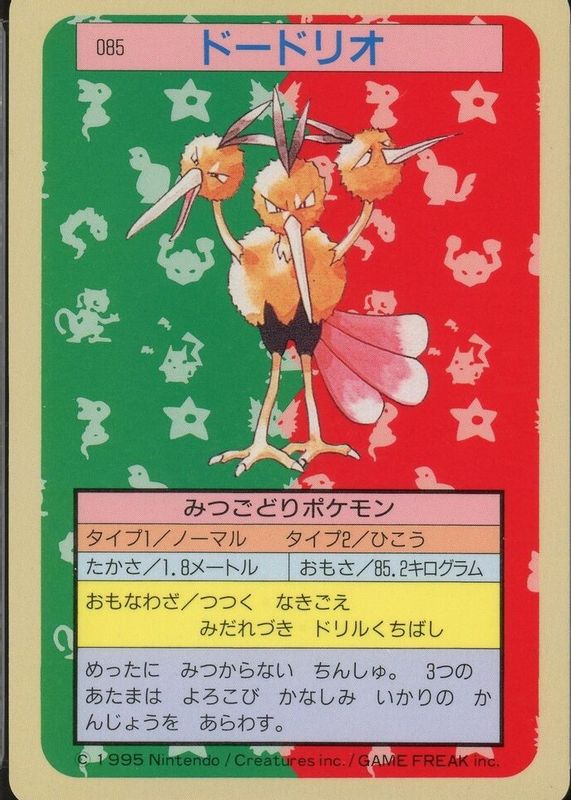 Dodrio's Pokemon cards are available in at least 24 sets. Dodrio's biggest 7-day price movers are 2024 Scarlet & Violet: Paldean Fates #200/091 Shiny Rare, 2023 Japanese Scarlet & Violet: 151 #085/165 Master Ball Reverse Holo, and 1997 Japanese Topsun #085 Blue Back (1st Edition).