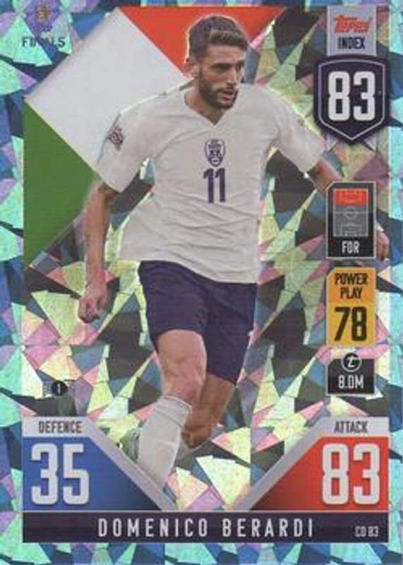 The biggest 30-day change Domenico Berardi cards are 2022 Topps Match Attax 101 Road to UEFA Nations League Finals #CD83 Blue Crystal, 2022 Topps Match Attax 101 Road to UEFA Nations League Finals #CD83 Base, and 2021 UEFA Euro 2020 Tournament Edition #26 Base.