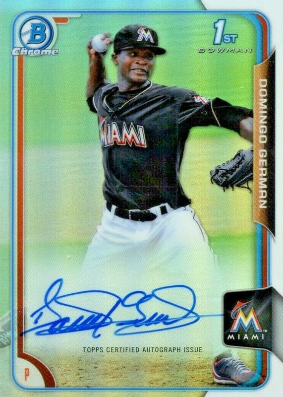 Domingo German's Baseball cards are available in at least 2 sets. Domingo German's biggest 7-day price movers are 2015 Bowman #BCAP-DGE Chrome Prospect Auto - Refractor /499 (1st), 2015 Bowman #BCAP-DGE Chrome Prospect Auto (1st), and 2024 Topps Tier One #T1R-DG Tier One Relics Buttons /5.