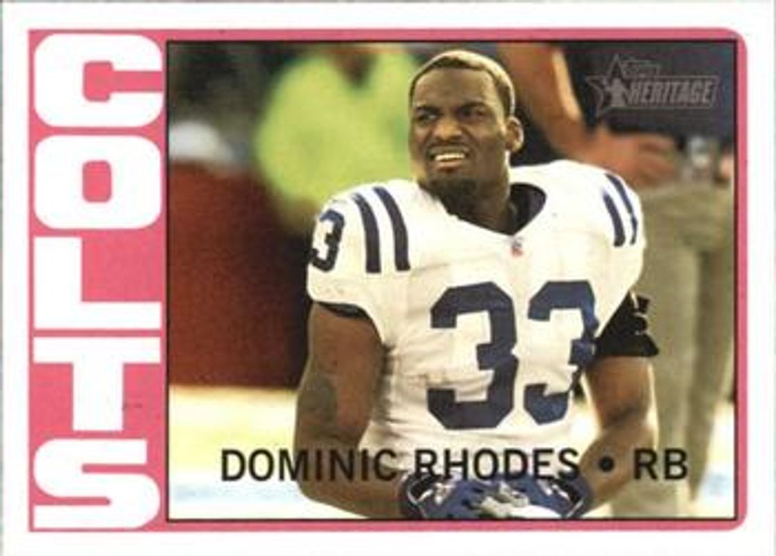 Dominic Rhodes' Football cards are available in at least 3 sets. Dominic Rhodes' biggest 7-day price movers are 2005 Topps Heritage #137 Base, 2003 Topps Total #238 Base, and 2003 Topps Total #238 Silver.
