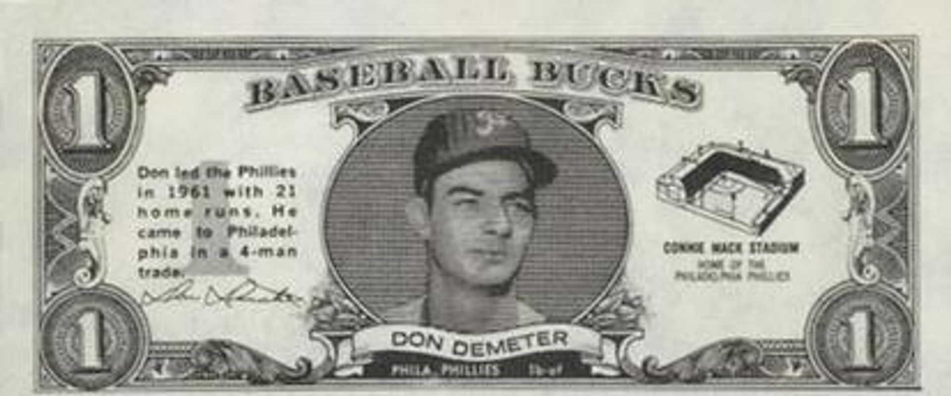 Don Demeter's Baseball cards are available in at least 20 sets. Don Demeter's biggest 7-day price movers are 1962 Topps Baseball Bucks Base, 1962 Topps Venezuelan #146 Base, and 1964 Topps #116 Coins.