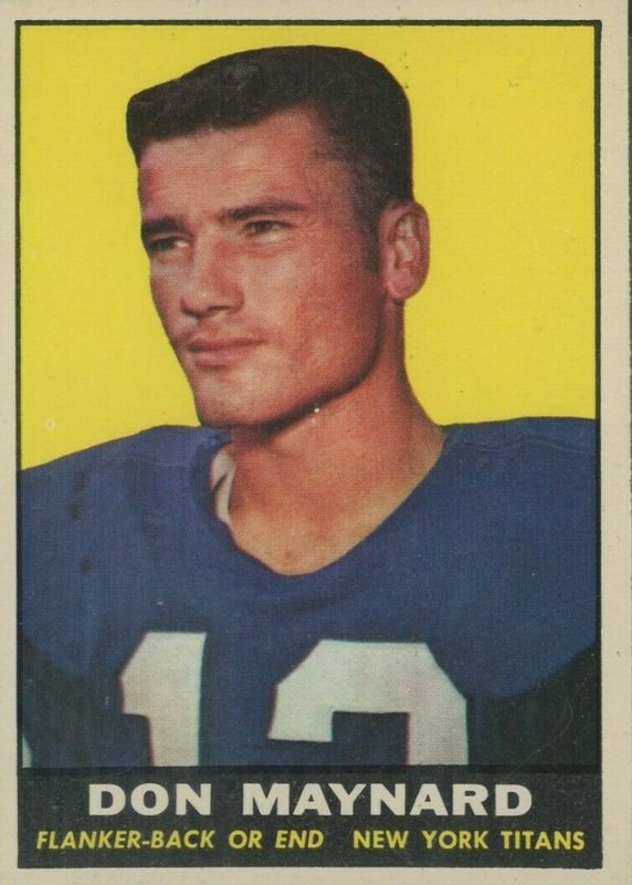 Don Maynard's Football cards are available in at least 55 sets. Don Maynard's biggest 7-day price movers are 1961 Topps #150 Base, 1961 Fleer #215 Base, and 1963 Fleer #15 Base.