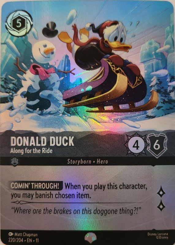 Donald Duck - Along for the Ride's Disney Lorcana cards are available in at least 1 sets. Donald Duck - Along for the Ride's biggest 7-day price movers are 2026 Winterspell #178/204 Base, 2026 Winterspell #178/204 Cold Foil, and 2026 Winterspell #220/204 Epic.