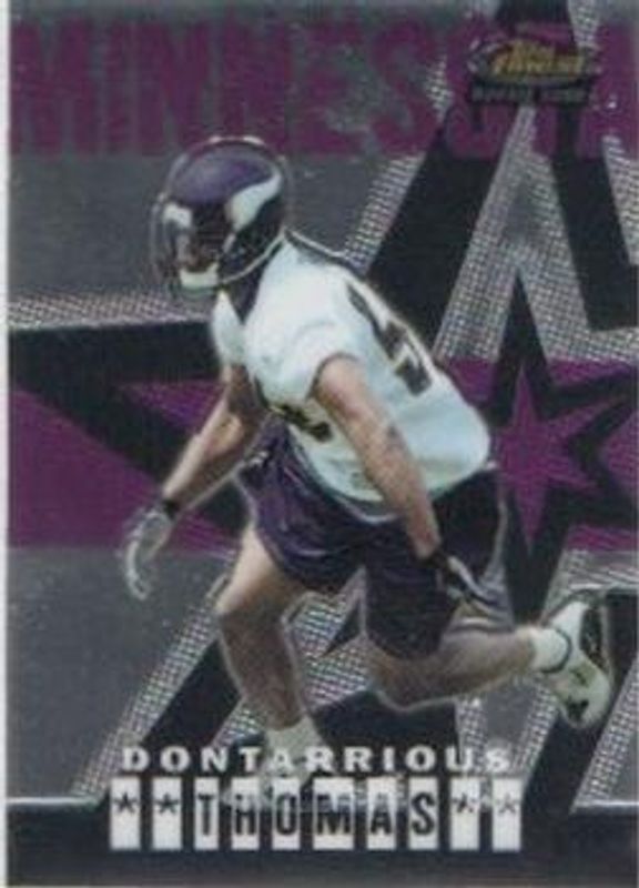 Dontarrious Thomas' Football cards are available in at least 1 sets. Dontarrious Thomas' biggest 7-day price movers are 2004 Topps Finest #68 Base /399, 2004 Topps Finest #68 Gold Refractor /50, and 2004 Topps Finest #68 Uncirculated Gold X-Fractors /150.
