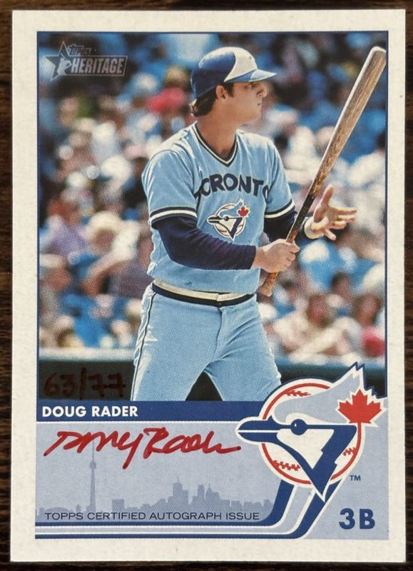 Doug Rader's Baseball cards are available in at least 30 sets. Doug Rader's biggest 7-day price movers are 2026 Topps Heritage #EA-DR Expansion Autographs - Red Ink /77, 2026 Topps Heritage #9 1977 Topps 50th Anniversary Stamped Buybacks, and 2026 Topps Heritage #EA-DR Expansion Autographs.