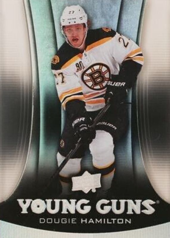 Dougie Hamilton's Hockey cards are available in at least 105 sets. Dougie Hamilton's biggest 7-day price movers are 2013 Upper Deck #202 Young Guns - Acetate, 2013 SP Authentic #304 Future Watch Auto /999, and 2013 Upper Deck #202 Young Guns - UD High Gloss /10.