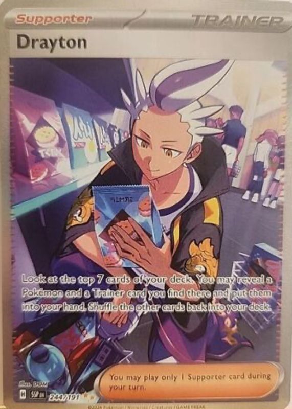 Drayton's Pokemon cards are available in at least 4 sets. Drayton's biggest 7-day price movers are 2024 Scarlet & Violet: Surging Sparks #232/191 Ultra Rare (Full Art), 2024 Japanese Scarlet & Violet: Paradise Dragona #060/064 Base, and 2024 Scarlet & Violet: Surging Sparks #174/191 Base.