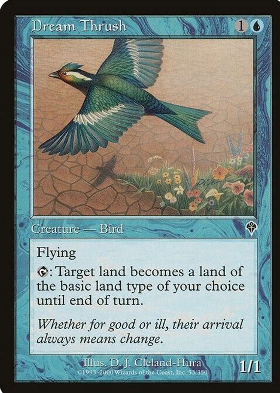 Dream Thrush's Magic: The Gathering cards are available in at least 1 sets. Dream Thrush's biggest 7-day price movers are 2000 Invasion #53 Base, and 2000 Invasion #53 Foil.
