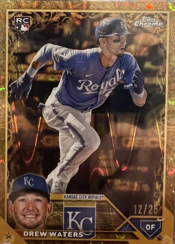 Drew Waters' Baseball cards are available in at least 22 sets. Drew Waters' biggest 7-day price movers are 2023 Topps Gilded Collection #87 RayWave Gold Etch Refractor /25, 2023 Topps Chrome #RA-DW Rookie Autographs - Purple Refractor /250, and 2023 Topps Chrome #RA-DW Rookie Autographs - Red Wave Refractor /5.