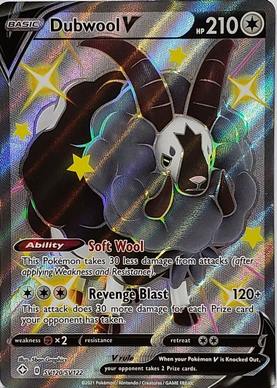 Dubwool V's Pokemon cards are available in at least 3 sets. Dubwool V's biggest 7-day price movers are 2020 Sword & Shield: Black Star Promo #SWSH049 Champion's Path Collection, 2020 Sword & Shield: Rebel Clash #188/192 Holo (Full Art), and 2021 Sword & Shield: Shining Fates #SV120 Shiny Rare (Full Art).