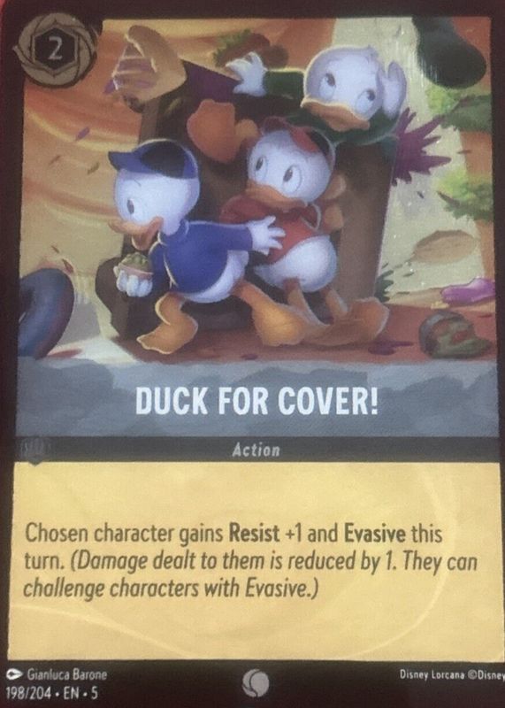 Duck for Cover!'s Disney Lorcana cards are available in at least 1 sets. Duck for Cover!'s biggest 7-day price movers are 2024 Shimmering Skies #198/204 Cold Foil, and 2024 Shimmering Skies #198/204 Base.
