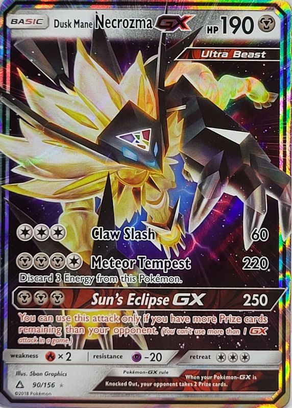 Dusk Mane Necrozma GX's Pokemon cards are available in at least 3 sets. Dusk Mane Necrozma GX's biggest 7-day price movers are 2018 Sun & Moon: Ultra Prism #090/156 Holo, 2018 Sun & Moon: Ultra Prism #145/156 Holo (Full Art), and 2017 Japanese Sun & Moon: Ultra Sun #044/066 Double Rare.