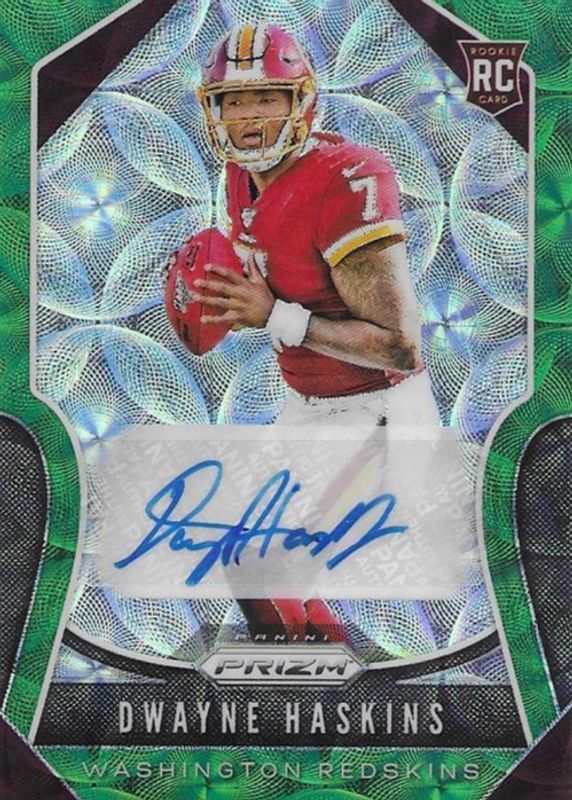 Dwayne Haskins' Football cards are available in at least 30 sets. Dwayne Haskins' biggest 7-day price movers are 2019 Prizm #303 Rookie Autographs - Green Scope /75, 2018 Select #303 XRC Prizm - Tie-Dye /25, and 2019 Prizm #303 Rookie Autographs - Camo /25.