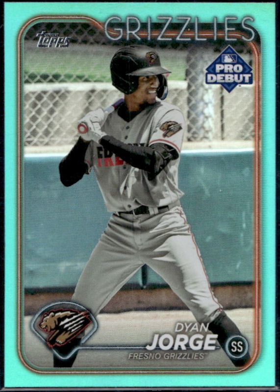 Dyan Jorge's Baseball cards are available in at least 5 sets. Dyan Jorge's biggest 7-day price movers are 2024 Topps Pro Debut #PD-170 Aqua Foil /75, 2024 Topps Pro Debut #PD-170 Base, and 2024 Topps Pro Debut #PD-170 Blue Foil /150.