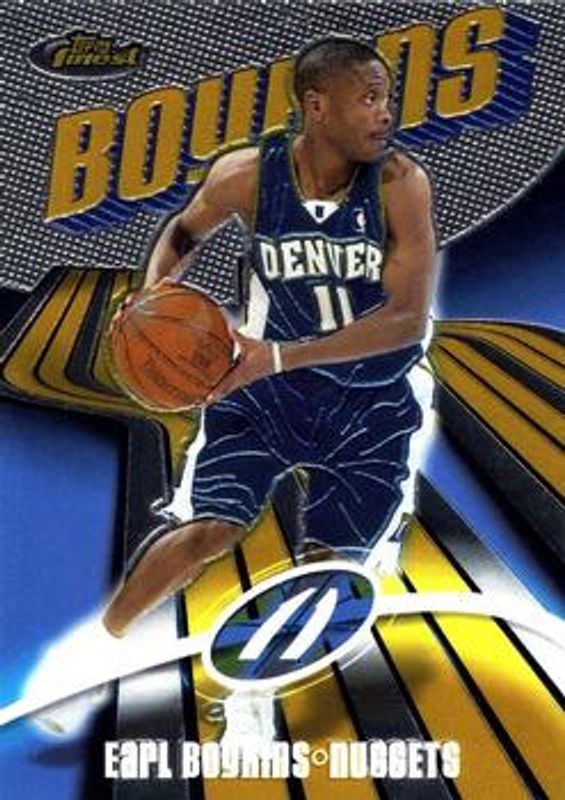Earl Boykins' Basketball cards are available in at least 25 sets. Earl Boykins' biggest 7-day price movers are 2003 Topps Finest #56 Base /999, 2003 Topps Finest #56 Printing Plate Black /1, and 2003 Topps Finest #56 Printing Plate Magenta /1.