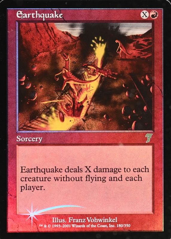Earthquake's Magic: The Gathering cards are available in at least 5 sets. Earthquake's biggest 7-day price movers are 2001 Seventh Edition #180 Foil, 1993 Alpha Edition Base, and 1999 Sixth Edition #173 Base.