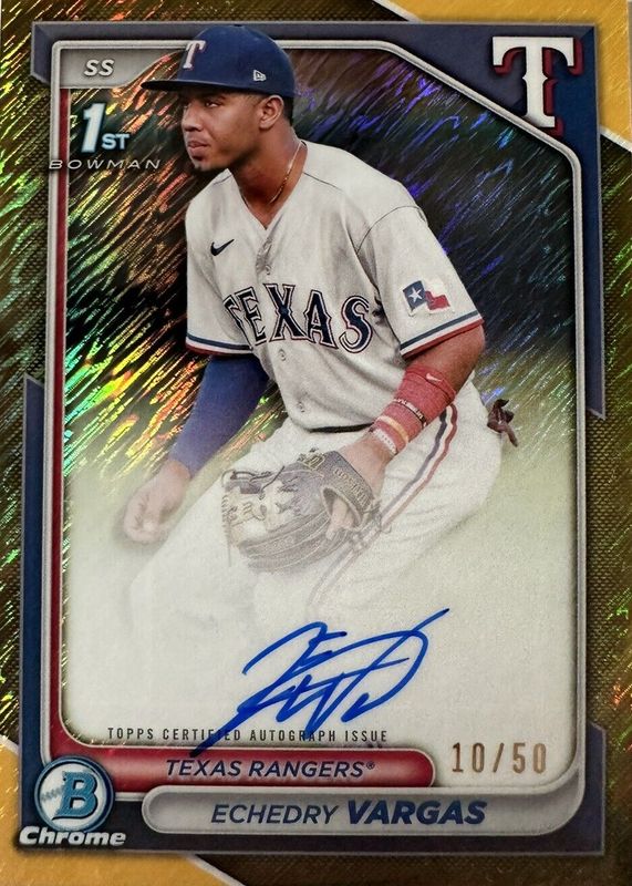 Echedry Vargas' Baseball cards are available in at least 6 sets. Echedry Vargas' biggest 7-day price movers are 2024 Bowman's Best #B24-EV Best of 2024 Autographs, 2024 Bowman Chrome #CPA-EV Prospect Auto (1st), and 2024 Bowman Chrome #CPA-EV Prospect Auto - Gold Shimmer Refractor /50 (1st).
