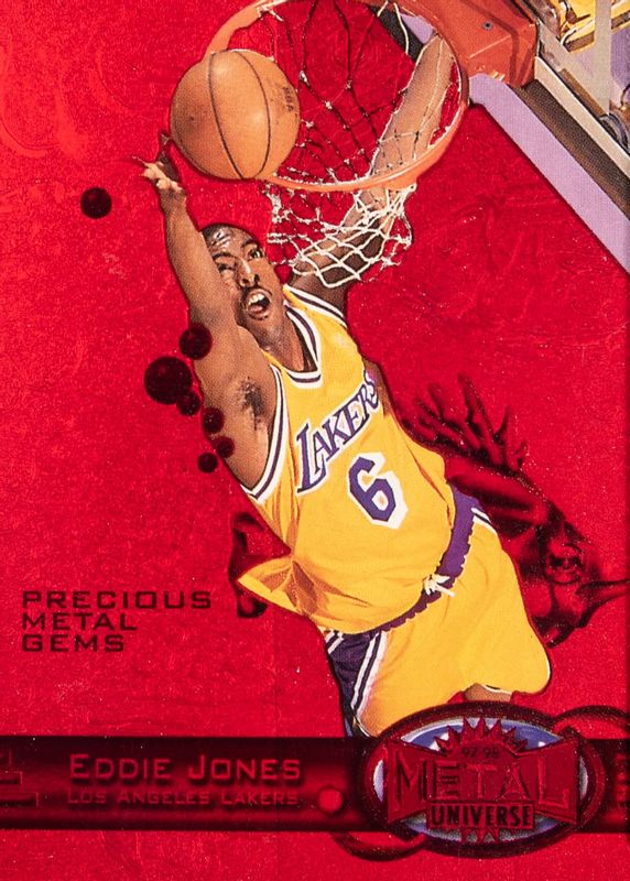 Eddie Jones' Basketball cards are available in at least 188 sets. Eddie Jones' biggest 7-day price movers are 1997 Metal Universe #94 Precious Metal Gems Red /90, 1997 Hoops #2HV High Voltage, and 1995 Flair #3 Hot Numbers.