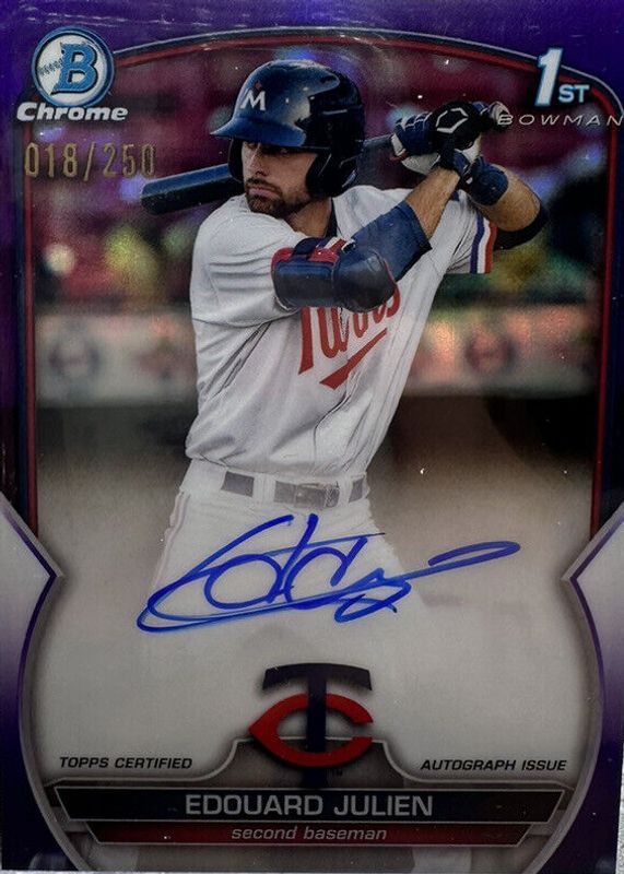 Edouard Julien's Baseball cards are available in at least 21 sets. Edouard Julien's biggest 7-day price movers are 2023 Bowman #CPA-EJ Chrome Prospect Auto - Purple Refractor /250 (1st), 2023 Bowman #CPA-EJ Chrome Prospect Auto - Refractor /499 (1st), and 2025 Topps #503 Holiday Fireworks /5.