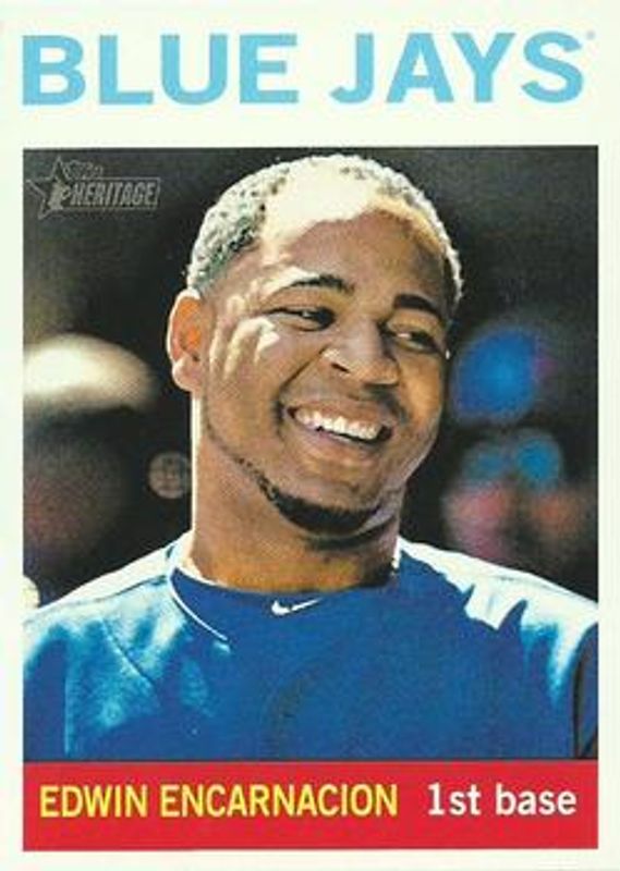 Edwin Encarnacion's Baseball cards are available in at least 31 sets. Edwin Encarnacion's biggest 7-day price movers are 2013 Topps Heritage #475 Base, 2012 Topps Heritage #463 Base, and 2013 Topps Heritage #CCR-EE Clubhouse Collection Relics.