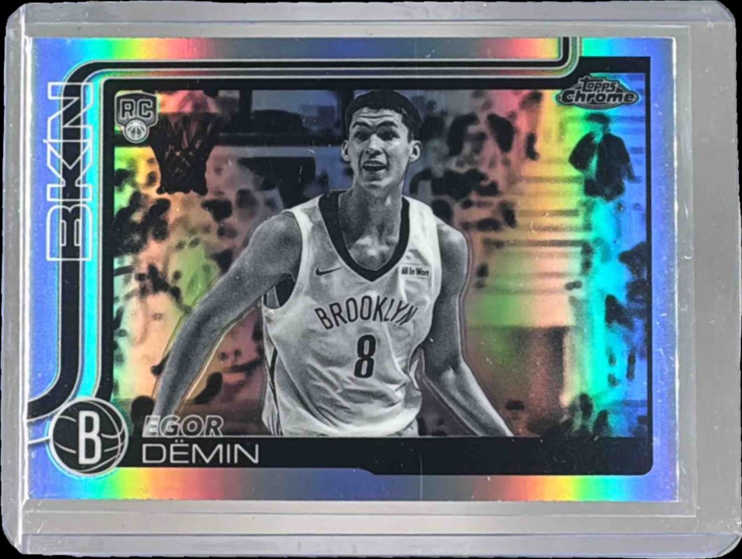 Egor Demin's Basketball cards are available in at least 4 sets. Egor Demin's biggest 7-day price movers are 2025 Topps #208 Blue Sandglitter, 2025 Topps #TFRR-ED Flagship Real One Rookie Autographs, and 2025 Topps Chrome #258 Pulsar Refractor.