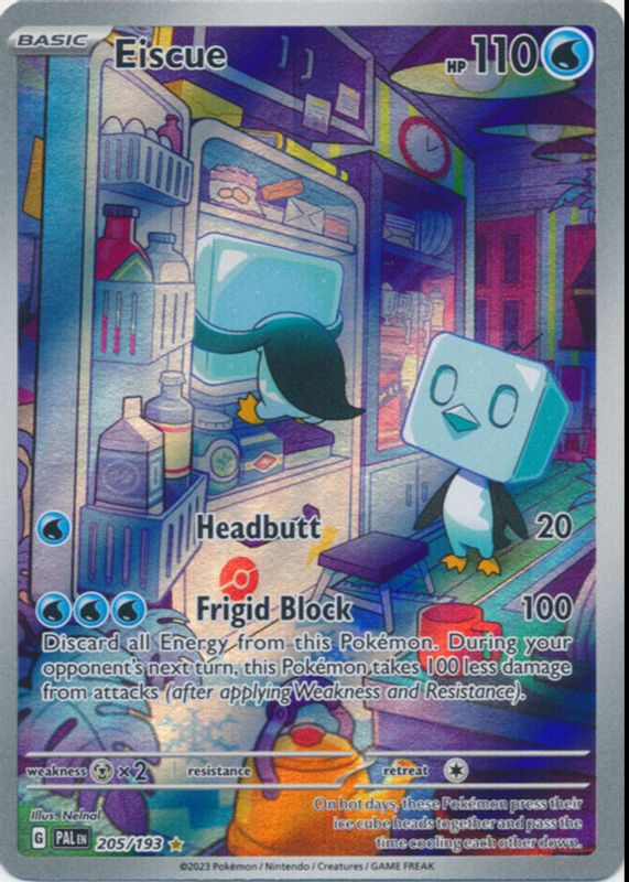 Eiscue's Pokemon cards are available in at least 6 sets. Eiscue's biggest 7-day price movers are 2023 Scarlet & Violet: Paldea Evolved #048/193 Reverse Holo, 2023 Scarlet & Violet: Paldea Evolved #048/193 Base, and 2021 Japanese Sword & Shield: VMAX Climax #041/184 Base.