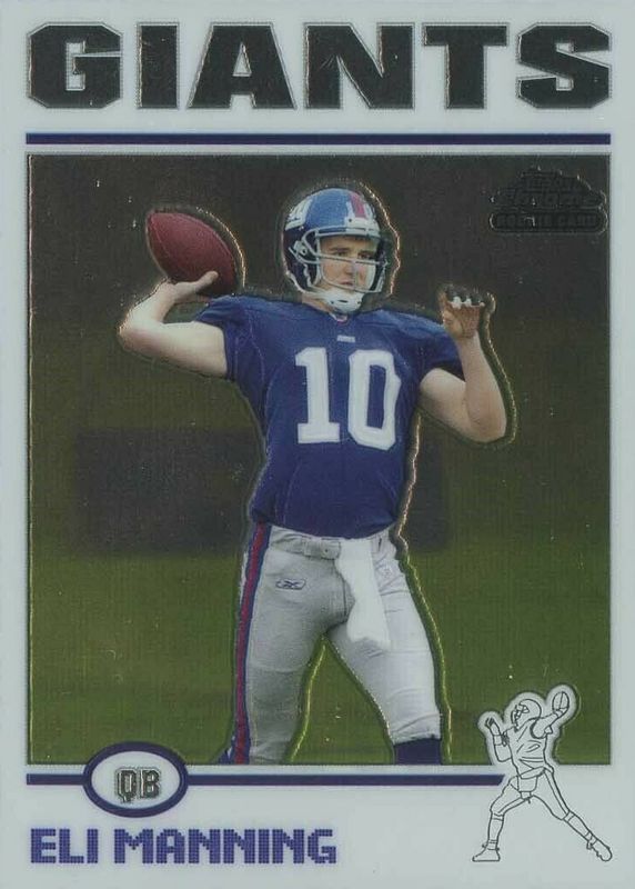 Eli Manning's Football cards are available in at least 378 sets. Eli Manning's biggest 7-day price movers are 2004 Bowman #111 Base, 2004 Topps Chrome #205 Base, and 2004 Topps #350 Base.