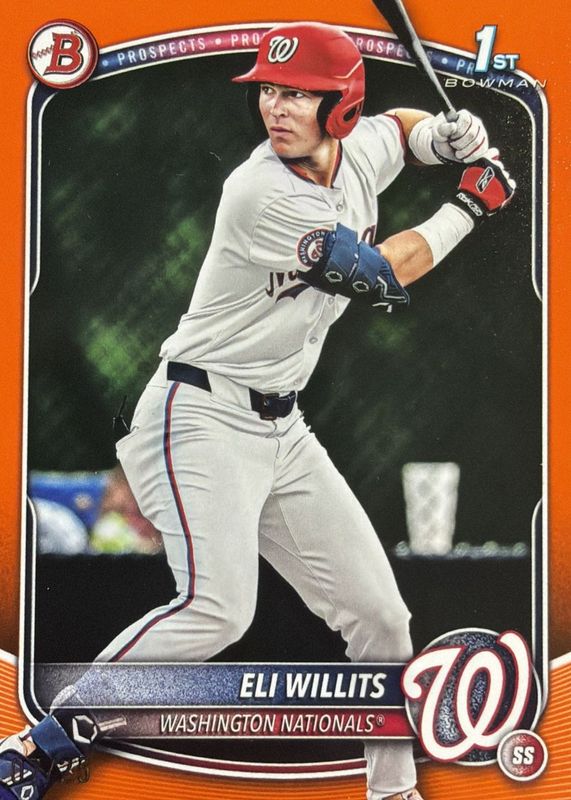 The biggest 30-day change Eli Willits cards are 2025 Bowman Draft #BD-96 Orange Border /25 (1st), 2025 Bowman Draft #BDC-1 Chrome - Sky Blue Refractor (1st), and 2025 Bowman Draft Mega Box #BDC-1 Chrome - Yellow Mega Refractor /75 (1st).