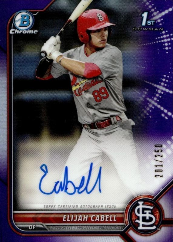 Elijah Cabell's Baseball cards are available in at least 1 sets. Elijah Cabell's biggest 7-day price movers are 2022 Bowman #CPA-EC Chrome Prospect Auto - Purple Refractor /250 (1st), 2022 Bowman #CPA-EC Chrome Prospect Auto - Refractor /499 (1st), and 2022 Bowman #CPA-EC Chrome Prospect Auto - Speckle Refractor /299 (1st).
