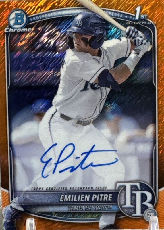 Emilien Pitre's Baseball cards are available in at least 7 sets. Emilien Pitre's biggest 7-day price movers are 2025 Bowman #CPA-EPI Chrome Prospect Auto (1st), 2025 Bowman #CPA-EPI Chrome Prospect Auto - Orange Shimmer Refractor /25 (1st), and 2025 Bowman's Best #B25-EP Best of 2025 Autographs.