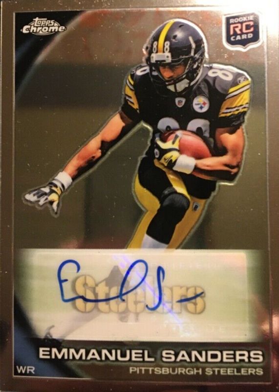 Emmanuel Sanders' Football cards are available in at least 130 sets. Emmanuel Sanders' biggest 7-day price movers are 2010 Topps Chrome #C106 Rookie Autographs, 2019 Panini Instant #91 Green /10, and 2019 Panini Instant #91 Base.
