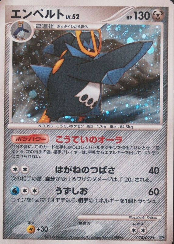 Empoleon's Pokemon cards are available in at least 14 sets. Empoleon's biggest 7-day price movers are 2013 Black & White: Legendary Treasures #035/113 Reverse Holo, 2008 Japanese Diamond & Pearl: Intense Fight in the Destroyed Sky #070/092 Unlimited Holo, and 2008 Japanese Diamond & Pearl: Intense Fight in the Destroyed Sky #070/092 1st Edition Holo.