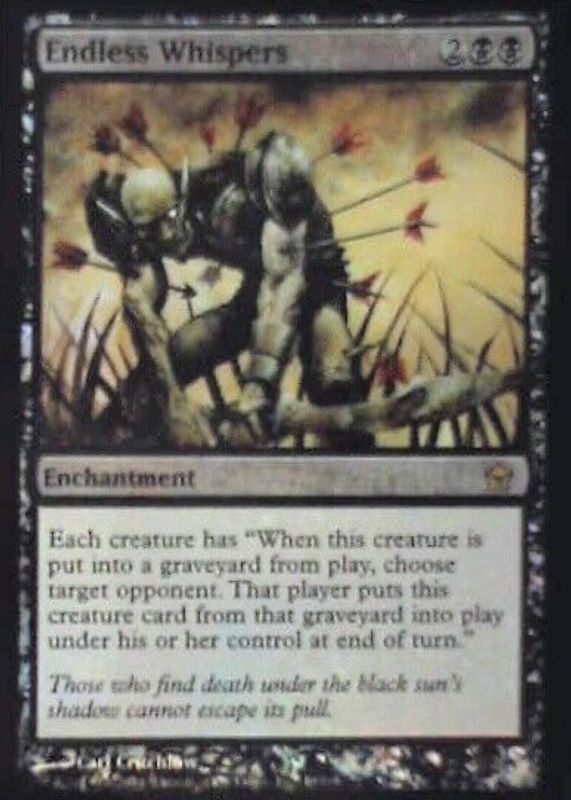 Endless Whispers' Magic: The Gathering cards are available in at least 1 sets. Endless Whispers' biggest 7-day price movers are 2004 Fifth Dawn #49 Foil, and 2004 Fifth Dawn #49 Base.