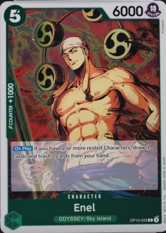Enel's One Piece cards are available in at least 2 sets. Enel's biggest 7-day price movers are 2025 Royal Blood #OP10-025 Foil, 2025 Extra Booster: Anime 25th Collection #EB02-052 Super Rare, and 2025 Extra Booster: Anime 25th Collection #EB02-052 Super Rare (Alternate Art).